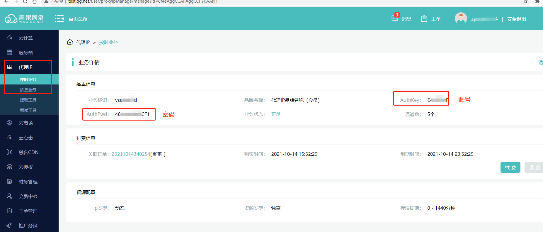1.购买代理IP后可以得到代理IP的账号和密码,在会员中心可查看详细的业务信息;